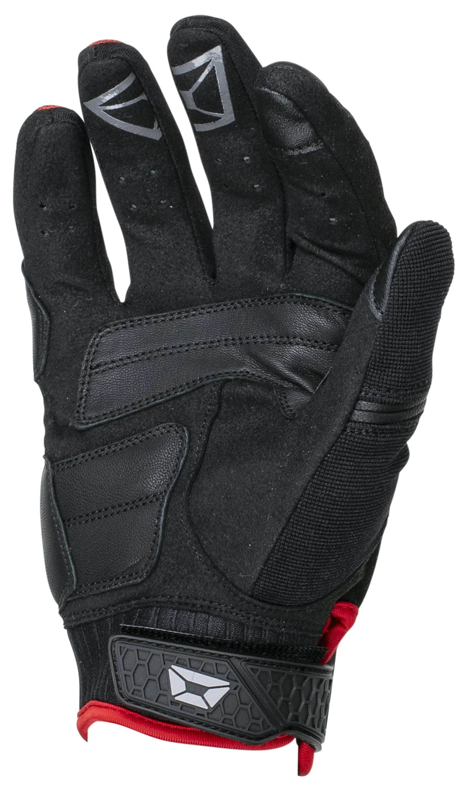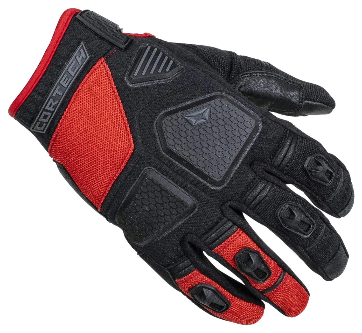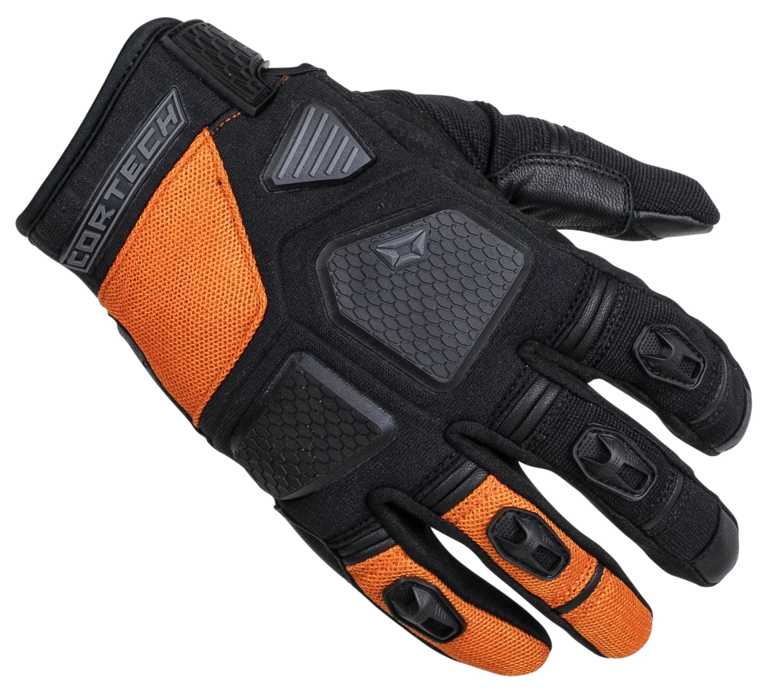 The summer weather Aero-Flo Gloves from Cortech use genuine goat hide overlays over a Clarino synthetic leather chassis. Critical areas at the side of the palm receive additional goat leather and impact padding. Air flowing textiles and perforation abound – with the hard TPR finger sliders even receiving vent holes. Touchscreen friendly index finger and thumb communicate easily with smart devices. When it comes to fit, comfort is an easy box to check with neoprene at the back of hand and a combination of Lycra and spandex used along the fingers.ย ย