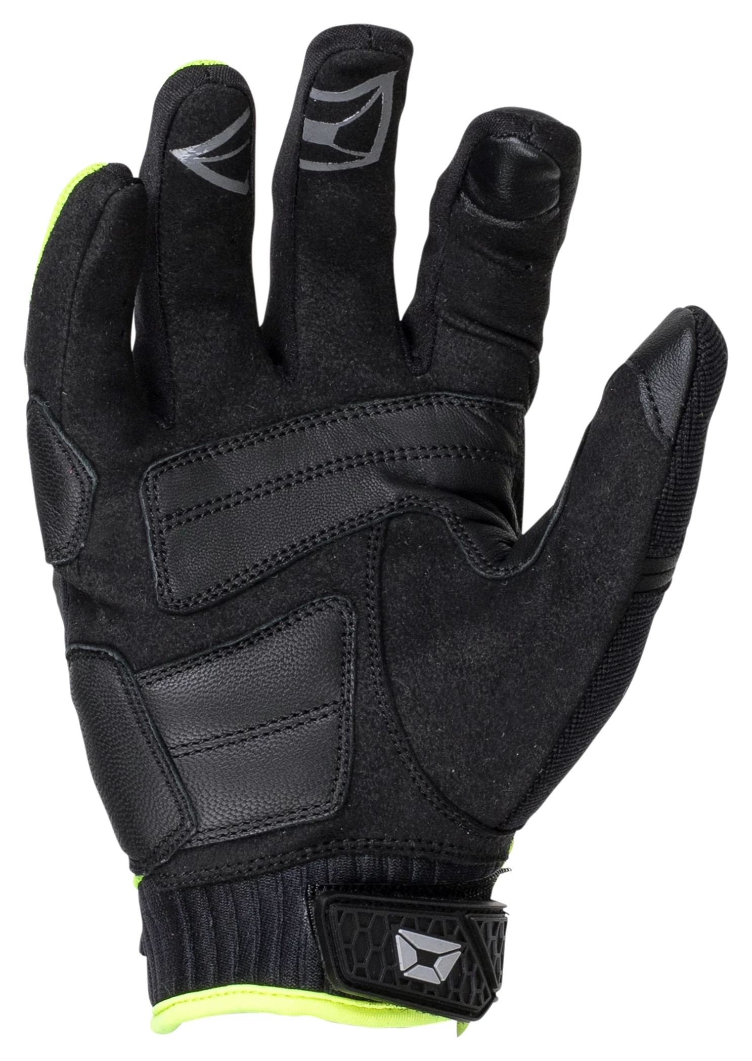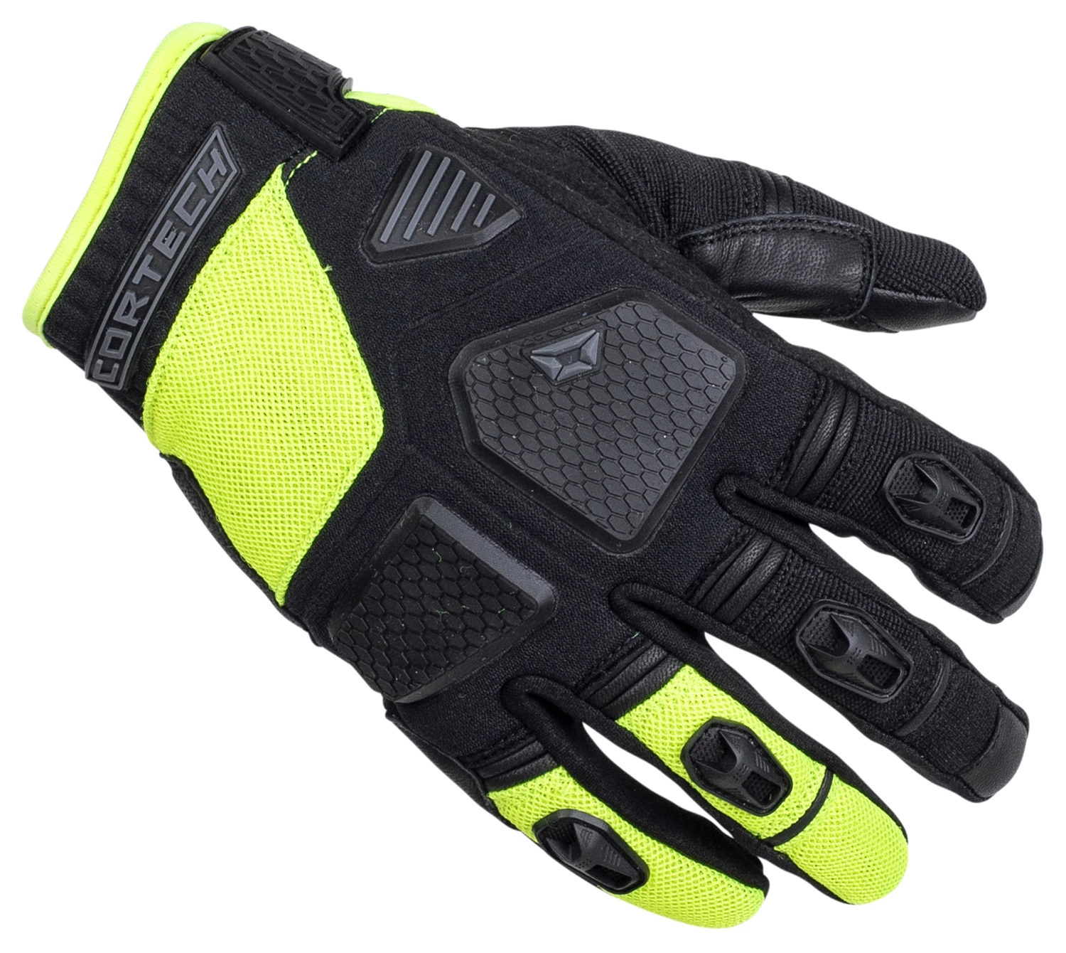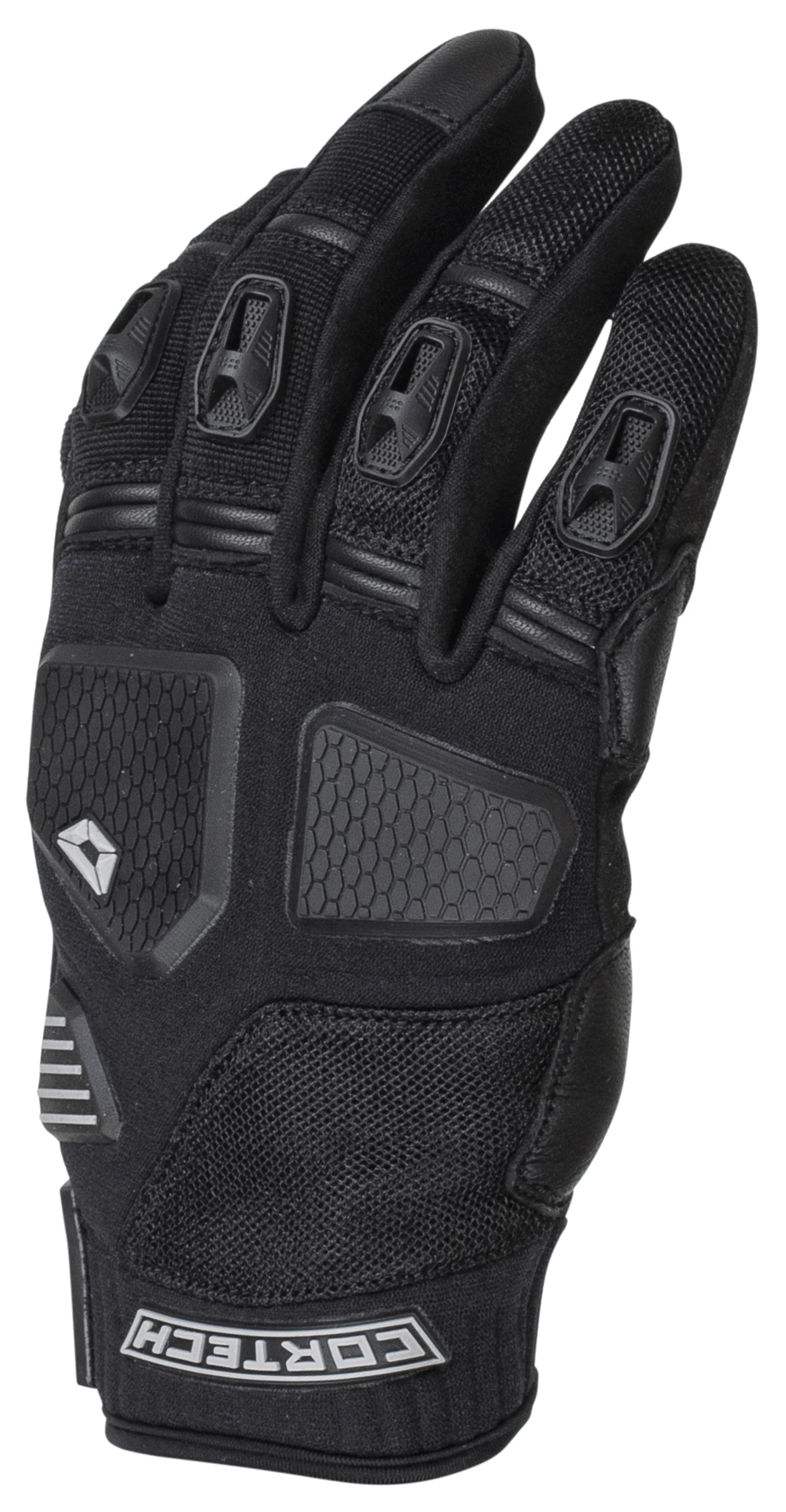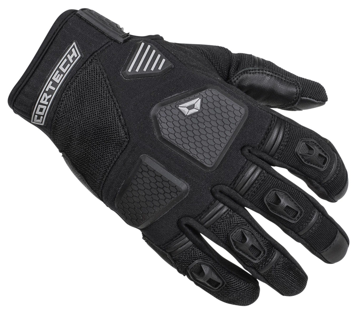 The summer weather Aero-Flo Gloves from Cortech use genuine goat hide overlays over a Clarino synthetic leather chassis. Critical areas at the side of the palm receive additional goat leather and impact padding. Air flowing textiles and perforation abound – with the hard TPR finger sliders even receiving vent holes. Touchscreen friendly index finger and thumb communicate easily with smart devices. When it comes to fit, comfort is an easy box to check with neoprene at the back of hand and a combination of Lycra and spandex used along the fingers.ย ย