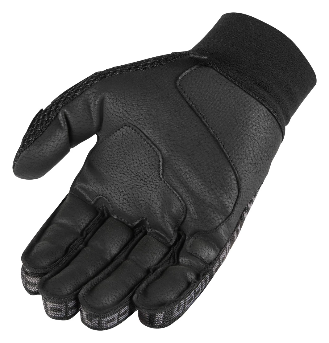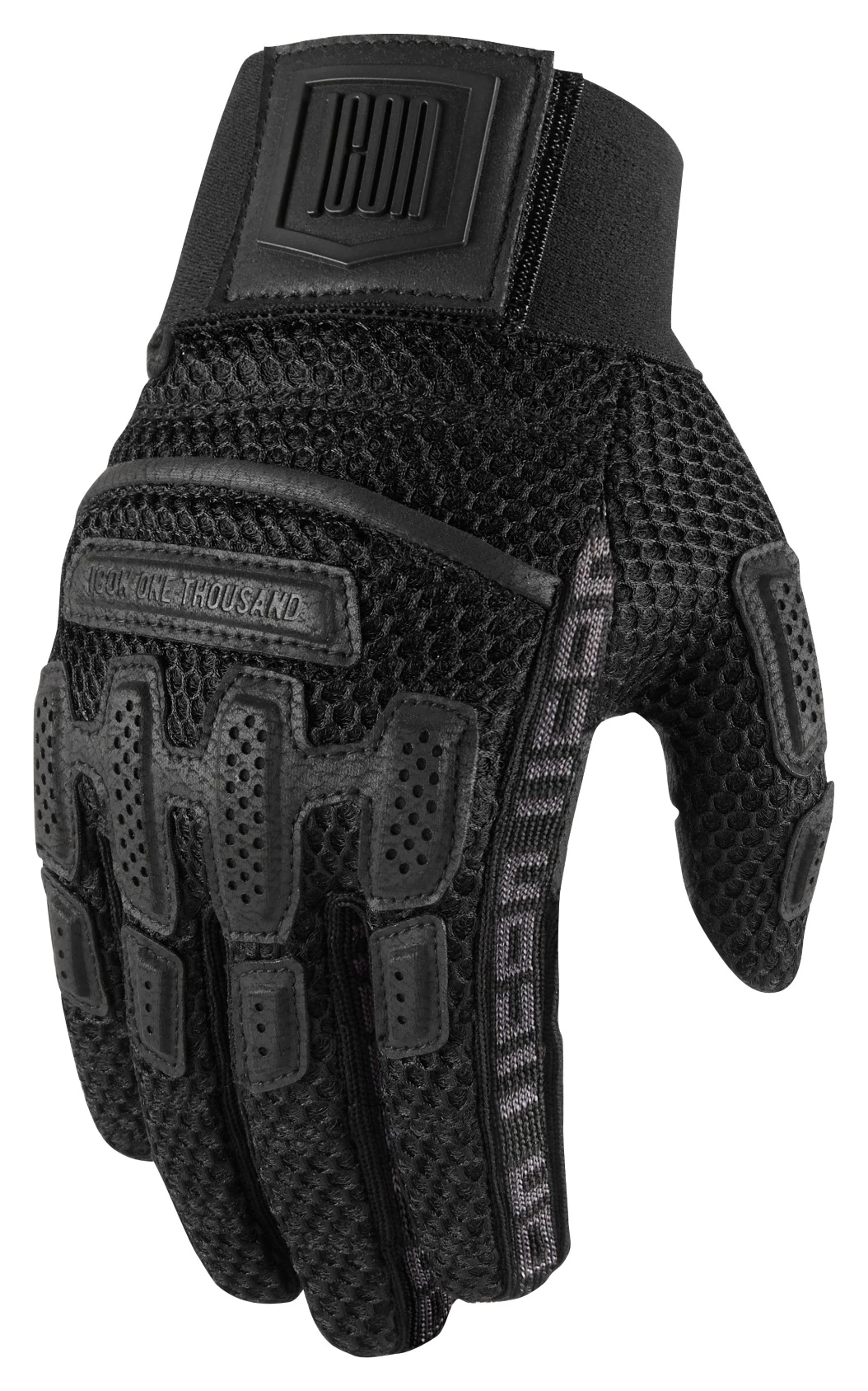 The Icon 1000 Brigand Gloves keep your hands cool when you’re doing your road bandit thing. This all black hot weather glove uses an AX Laredo palm for abrasion resistance and durability. Hi flow mesh on the back of the hand ventilates freely so you can keep riding protected as the temperatures climb. A basic hook and loop closure makes it quick to slip on or take off, perfect for when you need to make quick getaways. Touchscreen compatibility lets you interact with your smartphone without having to take off your gloves.ย