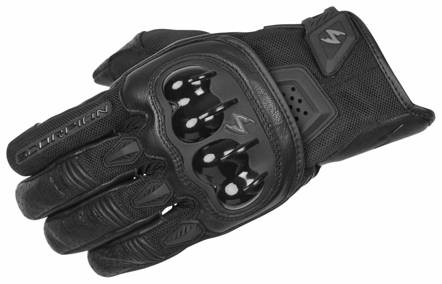 The Scorpion Talon is a short-cuff leather-palmed glove with maximum ventilation for warmer weather. The palm and fingertips are all full grain leather. The gripping zones have additional Nash synthetic leather for extra grip. But the back of the hand and the area between the fingers are all durable breathable mesh. Add the hard TPU knuckle protector, padded areas on the wrist and fingers and you have decent protection in a product designed for both on road and off road use.