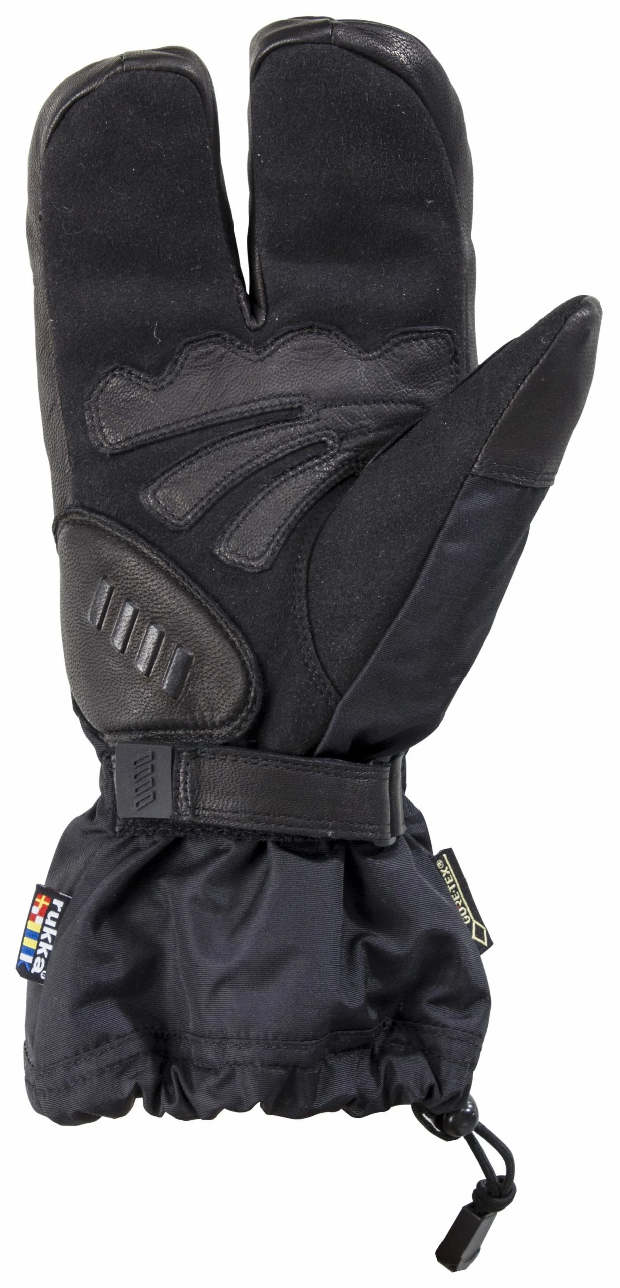 Rukka GTX 3 Chamb Gloves look like they were designed for Vulcans or Ninja Turtles, but the 3 finger design actually groups your fingers together to help keep your digits warm. Take on the weatherman’s bleak forecast with a visor wipe, fleece lining and Gore-Tex waterproofing.ย