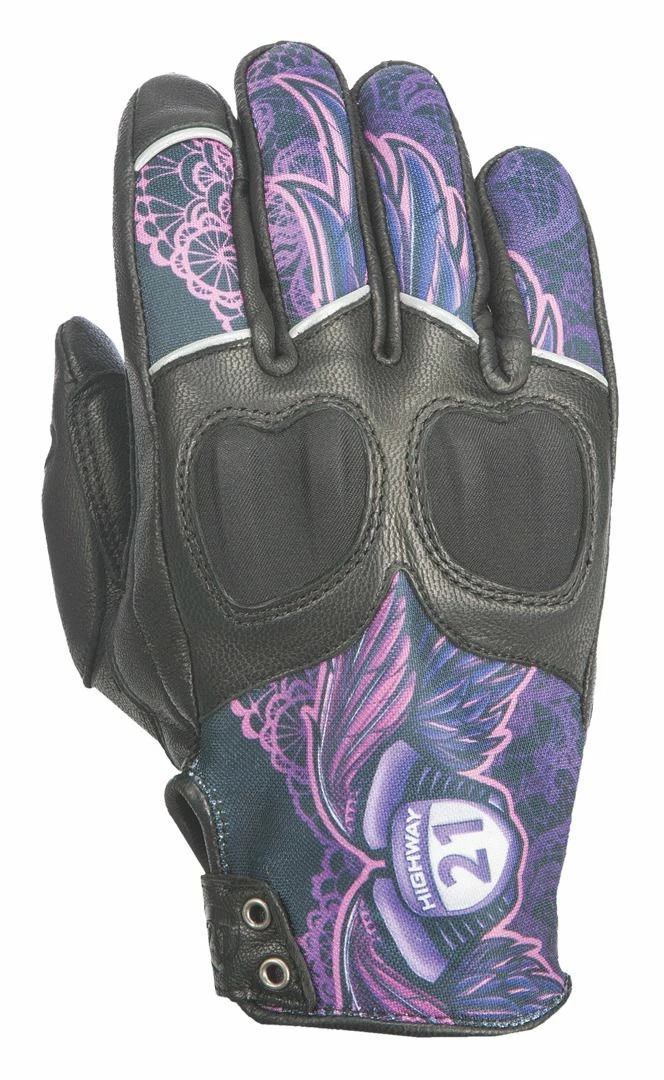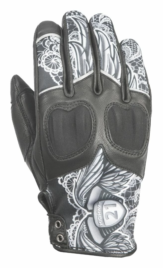 The Vixen Lace Women’s Gloves from Highway 21 are as foxy as their name implies.The gloves are accented with reflective piping for increased visibility in low light and the knuckles are reinforced with soft protection for added comfort. Part hard wearing goatskin leather, part breathable textile and total style, the Vixen will ensnare you with its good looks and ample protection.